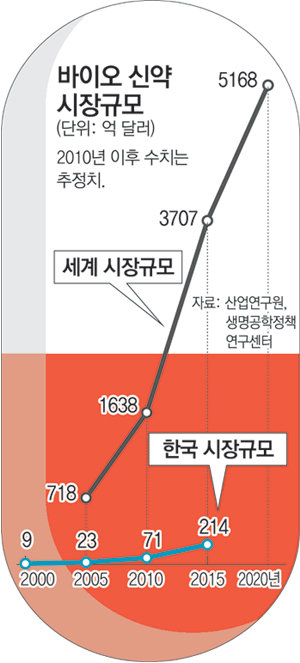 한국바이오벤처협회에 따르면 현재 국내 바이오 기업 수는 약 700여 개. 2000년 9억 달러 규모였던 바이오 의약품 시장은 2005년 23억 달러로 커졌다. 2010년에는 71억 달러, 2015년에는 214억 달러로 성장할 것으로 예상된다.