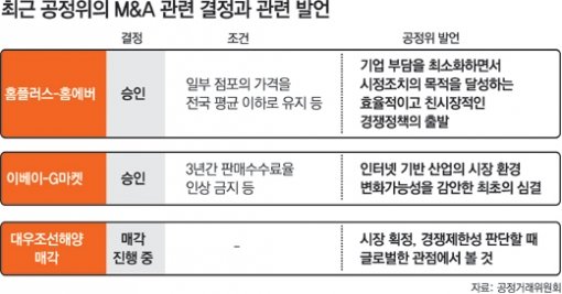 이는 2006년 이마트의 월마트 인수 때 4, 5개 지점 매각을 명령했던 것에 비하면 공정위의 정책이 얼마나 변했는지 실감하게 한다.