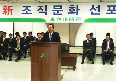 현대증권(대표이사 최경수)은 7일, 본사 15층에서 최경수 사장을 비롯한 본 • 지점 임직원이 참석한 가운데 <현대증권 新조직문화 선포식>을 가졌다고 밝혔다.
