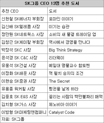 SK그룹은 13개 계열사 CEO들이 읽은 책 중에서 직원들에게 권하고 싶은 책 13권을 선정해 8일 발표했다. 추천 도서에는 큰 흐름에서 경영전략을 읽을 수 있는 역사 또는 경영 서적이 많았다.