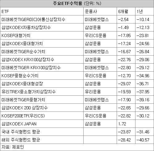 8일 한국증권선물거래소에 따르면 3분기(7∼9월) ETF의 일평균 거래대금은 약 1318억 원으로 2분기에 비해 2배 이상 늘었다. ETF는 코스피200, 특정 업종지수 등 시장의 움직임을 따라가기 때문에 하락장에서 시장을 이길 수 있는 상품은 아니다.