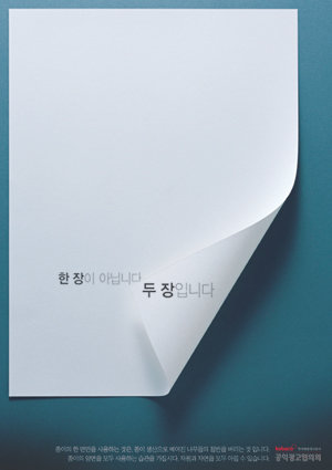 종이 끝이 살짝 말린 깨끗한 한 장의 종이 위에 ‘종이 한 장이 아닙니다’라는 간결한 카피만을 사용하여 심사위원 모두로부터 절제되면서도 깔끔하다는 평을 들은 수상작은 이면지 재활용 촉진을 위해 제작되었다.