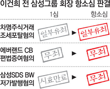 또 삼성에버랜드 전환사채(CB)의 편법증여 혐의는 1심과 같이 무죄 판결이 났다. 차명 주식거래 차익에 대한 양도소득세 포탈 혐의와 주식 변동 상황을 보고하지 않은 증권거래법 위반 혐의에만 1심과 같이 유죄가 인정됐다.