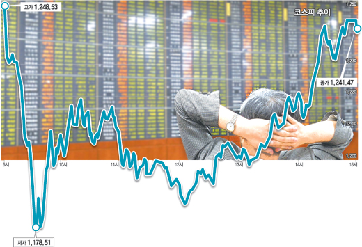 이날 증시는 오후 들어 연기금이 매수에 나서고 증권유관기관들이 공동으로 펀드를 조성해 증시에 투자하기로 했다는 소식이 전해지면서 하락폭이 크게 줄어 전날보다 53.42포인트(4.13%) 내리는 것으로 마감됐다.