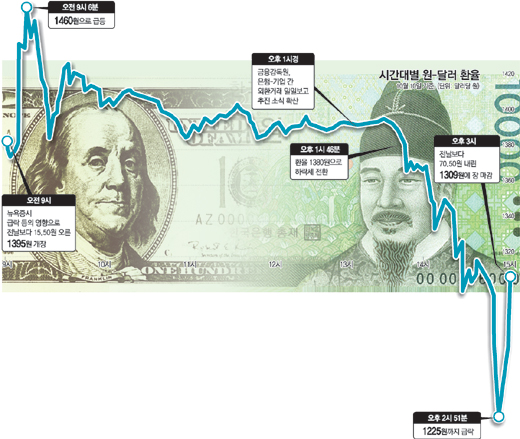 이날 환율은 극심한 변덕을 부렸다. 미국 뉴욕증시의 급락과 역외 시장의 매도세의 영향으로 전날보다 15.50원 오른 1395.0원에 장을 시작하더니 6분 만에 1460원까지 치솟았다.