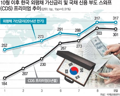 10일 기획재정부와 국제금융센터에 따르면 국제 금융시장에서 외평채(2014년 만기)의 미 국채 대비 가산금리가 8일 기준 317bp(1bp=0.01%)로 사상 최고치를 기록했다.