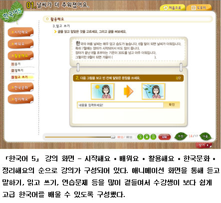 이번에 개설된 「한국어 5」과정은 직장생활에 필요한 표현 익히기, 자녀들을 훈계하거나 칭찬하기, 집을 구하거나 이사준비 하기, 귀화와 이직 등에 대한 정보를 얻거나 조언하기 등 일정 수준의 한국어 구사력을 갖춘 결혼이민자들이 한국 사회의 당당한 구성원으로 활동할 수 있도록 개발됐다. 이전 단계 강의에서 주로 듣기와 말하기를 학습했다면,「한국어5」에서는 한글 독해지문을 읽고 직접 워드로 답을 입력해서 한글 쓰기를 연습할 수 있는 영역이 추가되어 말하기, 듣기, 읽기, 쓰기를 종합적으로 배울 수 있다.