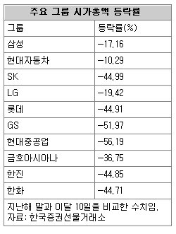 13일 한국증권선물거래소에 따르면 삼성, 현대자동차, SK, LG, 롯데 등 10대 그룹의 시가총액은 10일 기준 309조1660억 원으로 지난해 말 433조7474억에 비해 28.72% 감소했다.