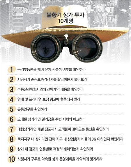 상가 전문가들은 “시장 상황이 안 좋은 만큼 상가를 고를 때는 상가의 좋은 점보다는 위험 요인을 정확히 파악하는 데 우선순위를 둬야 한다”고 조언한다.