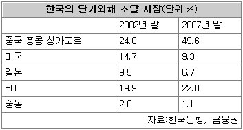2002년 말에는 한국의 단기외채 중 중국에서 조달한 비중이 2.8%, 홍콩 싱가포르는 21.2%로 3개 지역의 비중이 24%였다. 5년 만에 한국이 이 지역에서 단기외채를 빌리는 비중이 2배 남짓 높아진 것이다.
