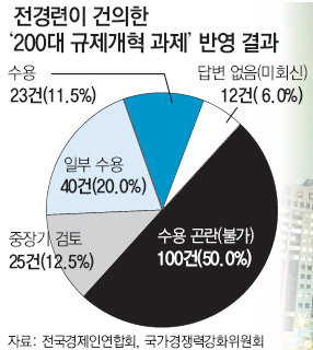 동아일보가 17일 입수한 ‘규제개혁 200대 과제 부처별 반영 경과보고서’에 따르면 대통령자문 국가경쟁력강화위원회가 전경련의 ‘200대 규제개혁 과제’에 대해 해당 19개 정부부처에 검토의견을 의뢰한 결과 수용 23건(11.5%), 일부 수용 40건(20.0%)에 그쳤다.