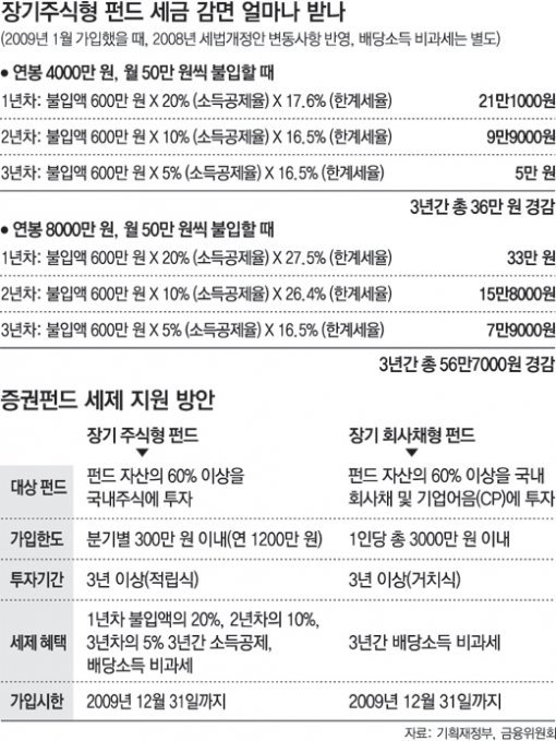 “장기주식형 펀드는 분기별 300만 원(연 1200만 원) 이내에서 3년 이상 투자하면 첫해 불입액의 20%, 2년차 불입액의 10%, 3년차 불입액의 5%에 대해 소득공제 혜택을 받을 수 있다. 배당소득에 대해서도 세금을 물지 않아도 된다. 장기회사채형 펀드는 3년간 발생하는 배당 소득에 대한 세금을 면제해 준다. 단, 2009년 12월까지 1인당 총가입금액 3000만 원 한도 내에서 혜택이 주어진다.”