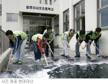 현대아산과 협력업체의 임직원 200여 명이 24일 서울 은평구 응암동 ‘서울시립 소년의 집’을 방문해 다양한 봉사활동(사진)을 한 뒤 위기 극복을 위한 결의를 다졌다.
