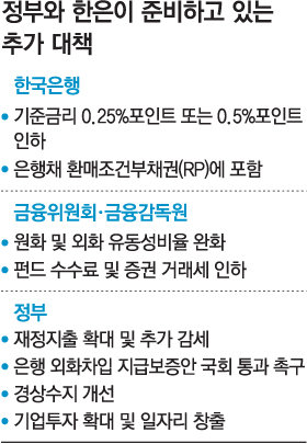 대책에는 △재정지출 확대 및 추가 감세 △은행 외화차입 지급 보증안의 국회 조속 통과 촉구 및 이에 따른 추가 방안 △수출 활성화, 에너지 절약, 여행수지 개선을 통한 경상수지 개선과 외국인 투자유치 강화 △기업투자 확대 및 일자리 창출 방안 등을 담을 예정이다.