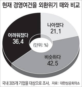 대한상공회의소는 국내 305개 기업을 대상으로 ‘글로벌 금융위기가 기업경영에 미치는 영향’을 조사한 결과 응답 기업의 78.9%가 ‘현재 경영 환경이 외환위기 당시보다 더 어렵다’(36.4%) 또는 ‘비슷하다’(42.5%)고 답했다고 27일 밝혔다. ‘외환위기 때보다 경영 여건이 낫다’는 응답은 21.1%에 그쳤다.