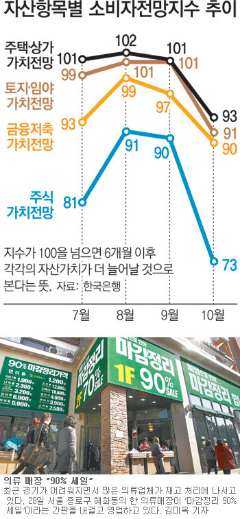 주식, 저축, 부동산 등 자산가치 하락으로 우려했던 소비심리의 위축이 현실화하고 있다. 소비심리가 움츠러든 가운데 세계 경기 침체에 따라 수출까지 꺾이면 실물경기 침체의 골이 더욱 깊어질 수 있다.