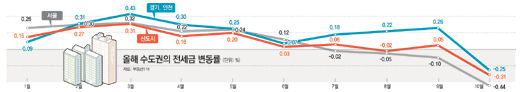 부동산114의 김규정 차장은 “10월 들어 전세금 하락이 전 지역으로 확산되고 있지만 여전히 국지적으로는 전세금이 오르고 있고, 연초 대비 기준으로 하락 지역은 손에 꼽을 정도”라며 “하락세라는 최근 통계를 근거로 저가 전세매물을 찾는다면 실망감이 클 것”이라고 말했다.