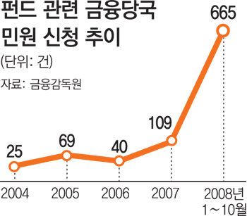 금융당국에 신청되는 펀드 관련 민원도 크게 늘고 있다. 우리파워인컴펀드와 관련한 배상 조정 결정이 난 직후인 12일과 13일 금감원에 접수된 민원은 각각 96건, 97건으로 종전 하루 평균 접수 건수(24건)의 4배 수준으로 급증했다.