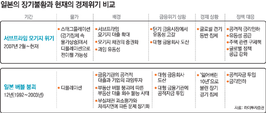 부동산과 주식 등 자산가격이 떨어지면서 개인은 소비를 줄이고 기업은 도산했습니다. 일본 정부는 여러 정책을 폈지만 큰 효과를 보지 못한 채 장기간 불황이 이어진 것입니다.