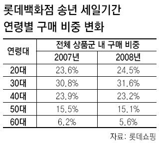품목별 매출 분석에서도 해외 명품이 지난해보다 44.6%, 여성 캐주얼이 33.5% 늘어나는 등 주로 젊은 층이 찾는 품목이 매출 증가를 주도한 것으로 나타났다. 남성 정장(―1.5%)과 여성 정장(―5.0%) 등 중년 이후가 선호하는 품목은 마이너스 성장이었다.