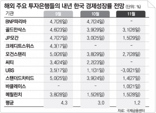 세계 주요 투자은행들이 전망한 내년 한국 경제성장률 평균치가 최근 1.2% 수준으로 떨어졌다.
