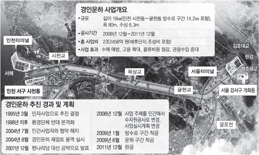 경인운하는 인천지역 하천인 굴포천이 범람하는 것을 막는 한편 물류비 절감을 위해 1995년부터 민자사업 형태로 시작됐다. 이후 환경단체의 반대가 계기가 돼 정부는 2004년 7월 민자사업자와의 협약을 해지했다.