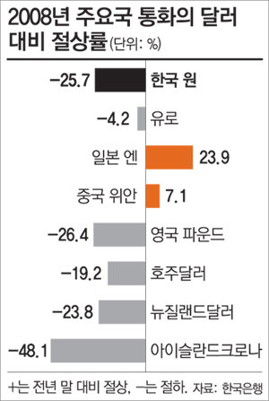 한국은행이 28일 발표한 ‘2008년 외환시장 동향’에 따르면 지난해 원화 가치는 달러화 대비 25.7%, 일본 엔화 대비 40.7% 절하됐다. 미 달러화에 대한 절하율은 아이슬란드크로나화(48.1%), 영국 파운드화(26.4%)에 이어 21개 주요국 중 세 번째로 높은 수준.