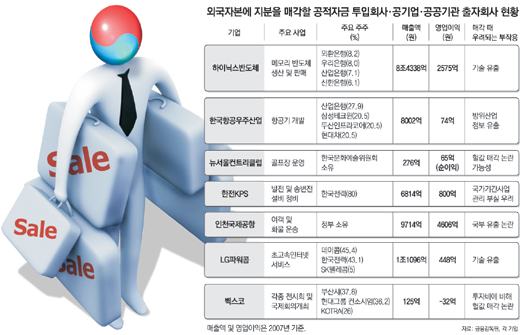 《정부가 18개 공기업과 공적자금 투입 회사의 지분을 외국인에게 팔기로 한 것은 국내 대기업들이 글로벌 경기침체를 맞아 대규모 투자에 몸을 사리는 현실을 감안한 고육책의 성격이 짙다. 경제위기를 극복하는 과정에서 막대한 자금이 필요한 만큼 공기업 지분을 팔아 이를 충당해야 하는데 국내엔 투자여력이 없으므로 국제시장에서 재원을 조달하겠다는 발상이다.》