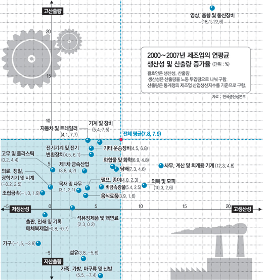 22개 제조업 중 생산성과 성장 2개 기준 모두에서 평균치를 넘은 업종은 반도체, 휴대전화, 방송 관련 시설 등을 아우르는 ‘영상, 음향 및 통신장비’ 1개뿐이었다.
