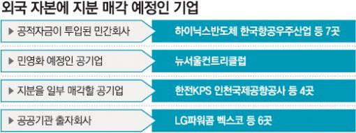 외국 자본이 매각입찰에 참여할 수 있는 기업은 △하이닉스반도체 한국항공우주산업(KAI) 등 공적자금이 투입된 민간회사 7곳 △작년 8월 1차 공기업 선진화 방안 발표 때 민영화가 확정된 뉴서울컨트리클럽 △한전KPS 인천국제공항공사 등 지분의 일부만 매각하기로 한 공기업 4곳 △LG파워콤 벡스코 등 공공기관 출자회사 6곳이다.