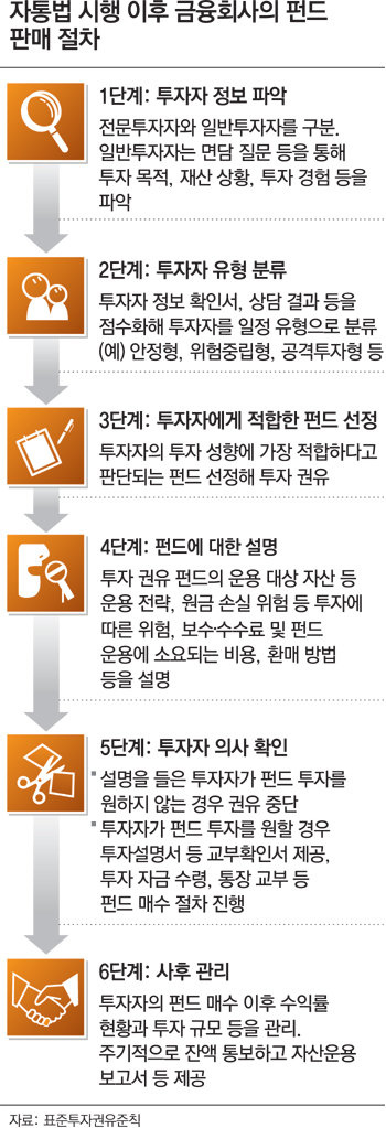 《투자자 보호장치를 획기적으로 강화한 자본시장통합법(자통법)이 4일부터 시행된다. 이날부터 투자자가 은행, 증권사, 보험사 등 금융회사를 방문해 금융투자상품에 가입할 때의 절차가 크게 달라진다. 금융투자상품은 은행 예·적금을 제외한 펀드, 주가연계증권(ELS), 채권 등 투자에 따른 원금 손실 가능성이 있는 상품을 뜻한다.》