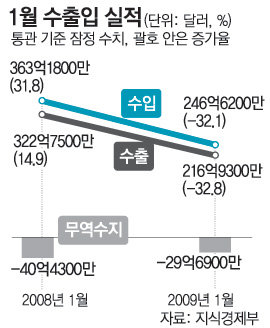 2일 지식경제부가 발표한 수출입 동향에 따르면 1월 수출은 지난해 1월에 비해 32.8% 줄어든 216억9300만 달러로 집계됐다. 이는 월별 수출입 통계가 남아 있는 1980년 이후 가장 큰 감소 폭이다. 이에 따라 무역수지는 2009년 첫 달부터 29억6900만 달러 적자를 보여 한 달 만에 적자로 반전했다.