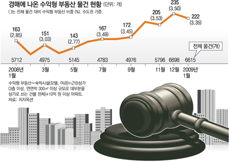 부동산 경매시장에 모텔, 근린상가, 10억 원 이상 고가 아파트 같은 ‘수익형 부동산’이 쏟아져 나오고 있다. 통상 불황기에 경매시장에는 서민형 부동산(연립·다가구·다세대주택, 저가 아파트)→생계형 부동산(단독상가)→수익형 부동산 순으로 매물이 나온다. 경기침체의 골이 워낙 깊다 보니 불황이 본격화하기 전부터 수익형 부동산이 매물로 등장하고 있는 것이다.