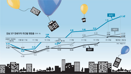 부동산정보업체인 부동산114에 따르면 강남 전세금은 지난달 중순부터 오르기 시작했다. 서초구는 1월 셋째 주(0.03%)부터 올랐으며 지난주에는 0.22% 상승했다.