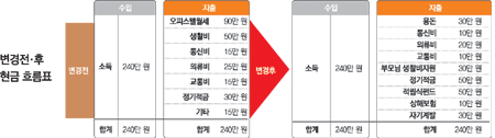 월급 240만 원 중 90만 원은 오피스텔 월세로 지출하고 △생활비 50만 원 △휴대전화와 인터넷 사용료 15만 원 △의류비 25만 원 △교통비 15만 원 △정기적금 30만 원 △기타 15만 원이다.