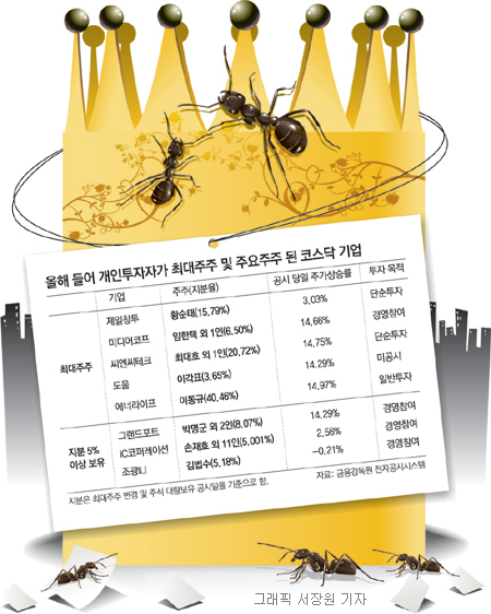 최근 코스닥 시장에서는 개인투자자(개미)가 최대주주에 오르는 기업을 쉽게 볼 수 있다. 이른바 ‘큰손’ 개미의 등장이다.