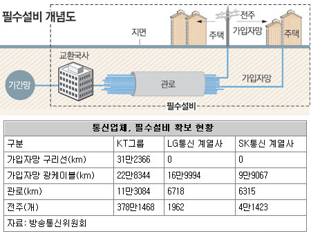 필수설비란 △각 지역의 전화국(교환국)에서 각 아파트의 통신실이나 단독주택까지 연결된 구리선 및 광케이블 △지하에 매설된 통신 관로 △지상에 세워진 전주 등을 말한다.