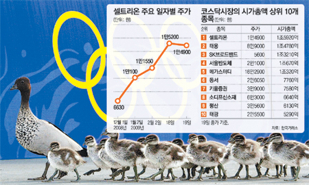 최근 셀트리온이 급등세를 보인 것은 코스닥시장에서 ‘녹색 뉴딜주’ ‘풍력주’ ‘바이오주’ 등 ‘테마주’ 중심의 장세가 펼쳐졌기 때문. 기관까지 테마주 매수에 동참해 어떤 테마가 강하게 움직이느냐에 따라서 시가총액 상위주인 셀트리온, 태웅. SK브로드밴드 등의 순위가 뒤바뀌는 상황이다.