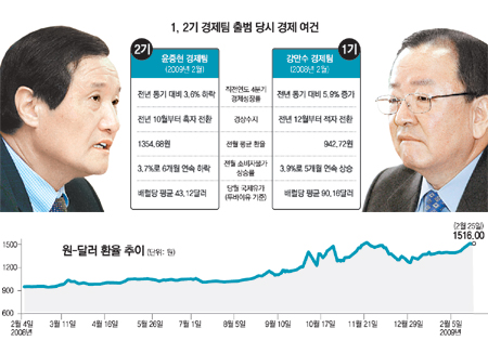 물가 상승의 주범으로 꼽혔던 국제유가도 골칫거리가 아니다. 1기 경제팀이 출범했던 2008년 2월 중동산 두바이유는 배럴당 90.16달러였지만 올해 2월엔 평균 43.12달러로 뚝 떨어졌다. 물가도 6개월 연속 하락해 환율 급등에 따른 수입 물가 상승 부담이 이전보다 덜하다. 오히려 세계경제는 경기 침체로 디플레이션(경기침체 속에 물가와 자산가격이 전반적으로 하락하는 현상)이 닥치는 상황을 우려하고 있다.