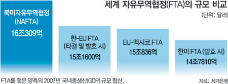 양측이 FTA를 맺으면 국내총생산(GDP) 기준으로 북미자유무역협정(NAFTA·16조309억 달러)에 이어 세계 2위(15조1600억 달러)의 거대 자유무역지대가 탄생하게 된다.