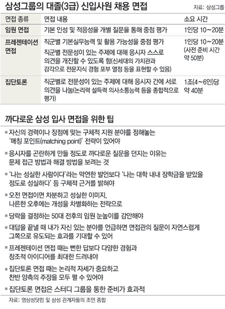 삼성 관계자들은 “프레젠테이션 면접 때는 뻔한 답보다 다양한 경험과 창조적 아이디어를 최대한 보여주고 집단토론 면접 때는 찬반 양측의 주장을 모두 펼 수 있는 논리적 유연성이 중요하다”고 귀띔했다.