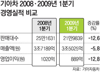 영업이익도 889억 원으로 지난해 1분기보다 12.8% 감소했다. 기아차 관계자는 “불황으로 경·소형차의 판매 비중이 확대되면서 부가가치가 높은 레저용차량(RV)의 비중이 축소돼 손실 폭이 커졌다”고 설명했다. 하지만 환율 상승효과로 매출액은 5.8% 하락에 그쳤다. 이번 1분기에 글로벌 시장 점유율을 1.9%에서 2.3%로 끌어올린 기아차는 점유율 확대에 더욱 주력할 계획이다.