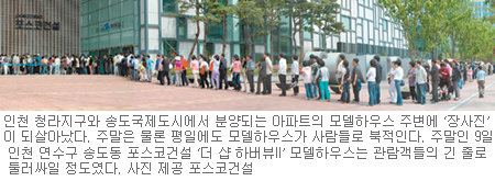 2012년 5월 송도국제도시 D15블록에 들어설 예정인 이 아파트의 모델하우스는 분양 상담 코너와 평형별 구조를 둘러보는 곳에서 줄을 서야 했다. 또 모델하우스 주변에는 몰래 분양권 거래를 하려는 ‘떴다방’까지 등장했다. 8일 개관한 뒤 주말에는 평균 1만여 명, 평일에는 평균 4000여 명이 다녀갔다.