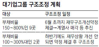 채권단이 대기업그룹 9곳과 다음 달 초까지 재무구조개선약정을 체결키로 함에 따라 지지부진했던 대기업 구조조정 작업에 속도가 붙을 것으로 보인다. 다른 그룹 2곳도 하반기 중 재무 건전성을 크게 높이지 못하면 추가로 약정을 맺어야 해 구조조정 대상은 더 늘어날 수 있다.
