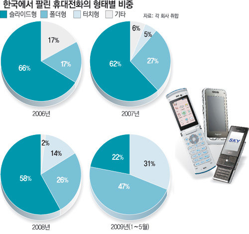 동아일보 산업부가 2006년부터 올해 5월까지 한국 시장에 나온 휴대전화 328종을 분석한 결과 지난해까지 60% 안팎이던 슬라이드형의 비중은 올해 22%로 추락했다. 반면 폴더형이 올 들어 나온 32종의 제품 중 가장 많은 15종(47%)이었고 터치형이 10종(31%)으로 뒤를 이었다. 지난해 유형별 비중은 △슬라이드 58% △폴더 26% △터치 14% 등이었다.