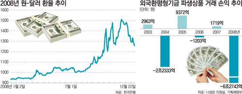 국회 기획재정위원회 소속 나성린 의원(한나라당)은 최근 ‘2008회계연도 기금결산보고서’를 분석한 결과 지난해 외국환평형기금(외평기금)이 파생상품 거래로 사상 최대인 6조3000억 원 규모의 손실을 입었다고 밝혔다. 외환시장 안정을 위해 정부가 운용하는 외평기금의 지난해 실적을 따져 보니 파생거래 수입이 5조3025억 원, 파생거래 지급은 11조5768억 원으로 6조2743억 원의 순손실을 입었다는 것이다.