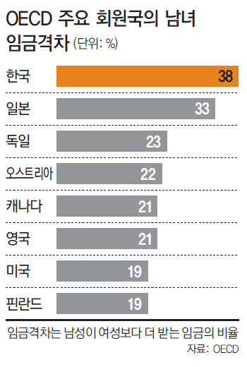 9일 기획재정부에 따르면 OECD가 최근 내놓은 ‘사회·노동·인구이동’ 보고서에서 지난해 한국 남성의 임금은 여성보다 평균 38% 많아 임금격차가 가장 큰 국가로 나타났다. 이는 OECD 평균인 18.8%보다 2배 정도 많은 것이다.