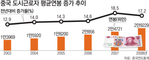 해마다 뛰어오르는 인건비도 문제다. 중국에 액세서리 생산 공장을 운영하는 D사 관계자는 “최근 인건비가 너무 많이 올랐다”며 “요즘 같아선 한국에서의 생산이 중국에서보다 경쟁력 있을 수 있다”고 말했다. 실제 중국 연도통계 자료에 따르면 2003년 이후 현지 도시 근로자 평균연봉은 매년 13.0∼18.5%씩 상승하는 추세다. 세계가 불황에 시달린 올 1분기(1∼3월)에도 중국의 도시 근로자 임금은 전년 동기보다 13.4% 상승했다.