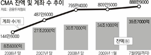 하지만 CMA는 은행권의 가상계좌를 이용해야만 자금 이체가 가능한 한계에서 벗어나지 못했다. 올 2월 시행된 자본시장법은 증권사의 소액지급결제 서비스를 가능하게 함으로써 CMA를 은행에서 독립시켰다. 증권사들이 연 4%대의 금리를 제공하는 공격적인 마케팅을 펼치면서 올해 1월 34조1000억 원이었던 CMA 잔액은 이달 9일 현재 39조7000억 원으로 6개월 만에 5조6000억 원이나 늘었다.