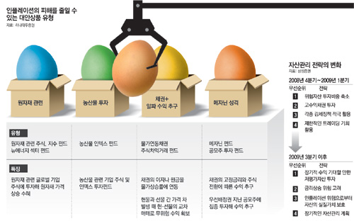 가장 손쉽게 인플레이션에 대비할 수 있는 투자상품은 원자재 펀드다. 1980년대 이후 세 차례의 글로벌 인플레이션 국면에서 CRB상품지수(각종 원자재가격을 수치화한 지수)는 모두 물가상승률(OECD 소비자물가 상승률 기준)을 크게 웃돌았다. 김대열 하나대투증권 연구원은 “CRB지수가 인플레이션 이상의 수익률을 냈듯이 인플레이션 회피(헤지)수단으로 원자재 관련 상품은 필수적”이라며 “장기적인 성장 가능성을 볼 때 뉴에너지(녹색성장)와 농산물 투자도 필요하다”고 말했다.